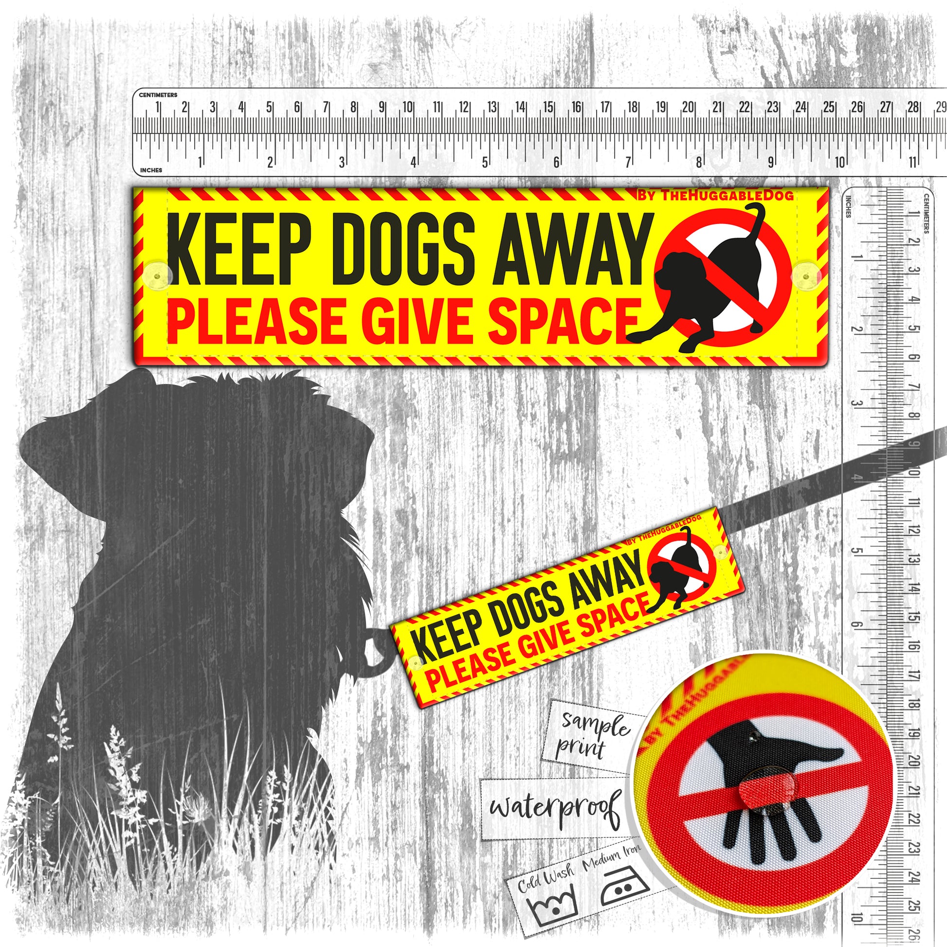"KEEP DOGS AWAY, please give space". Warning leash sleeves for dog training.