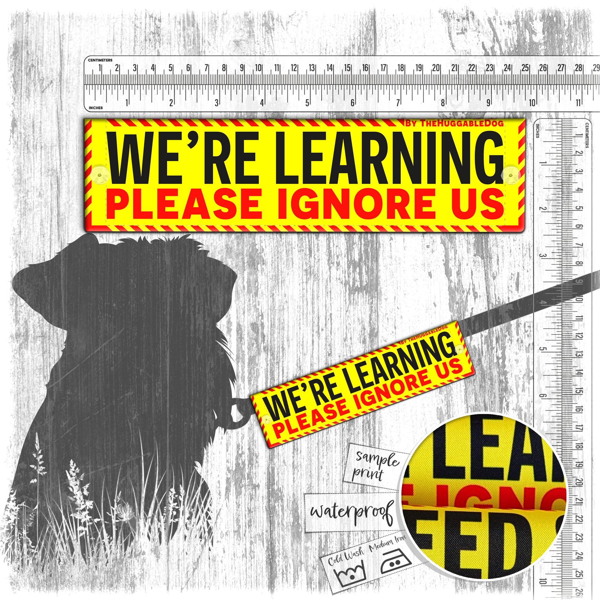 49. "WE'RE LEARNING, space ignore us". Warning leash sleeves for dog training.